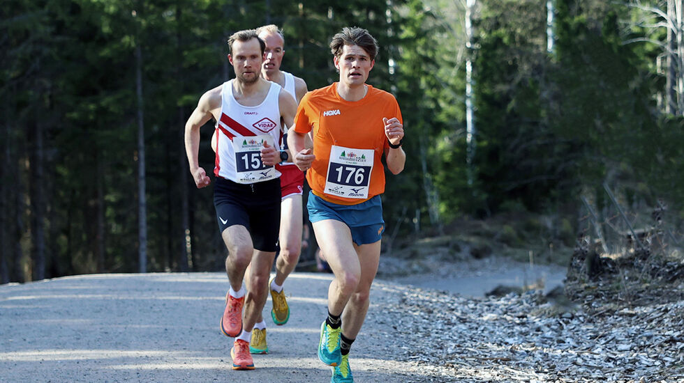 En trio i front satte opp høy fart ut fra start og allerede etter to kilometer var det blitt en god luke bakover. Sjur Krystad Prestsæter og Jostein Rogstad, begge fra SK Vidar, løp sammen de første 5-6 kilometerene, men da sa førstnevnte takk for laget og reiste i fra. Prestsæter, som ble nummer to i Sentrumsløpet for et par uker siden, løp i mål på 37.07 og var over minuttet foran Rogstad, som avsluttet på 38.12. På tredjeplass fulgte Kristoffer Eftedal fra Sandefjord Turn & Idrettsforening.