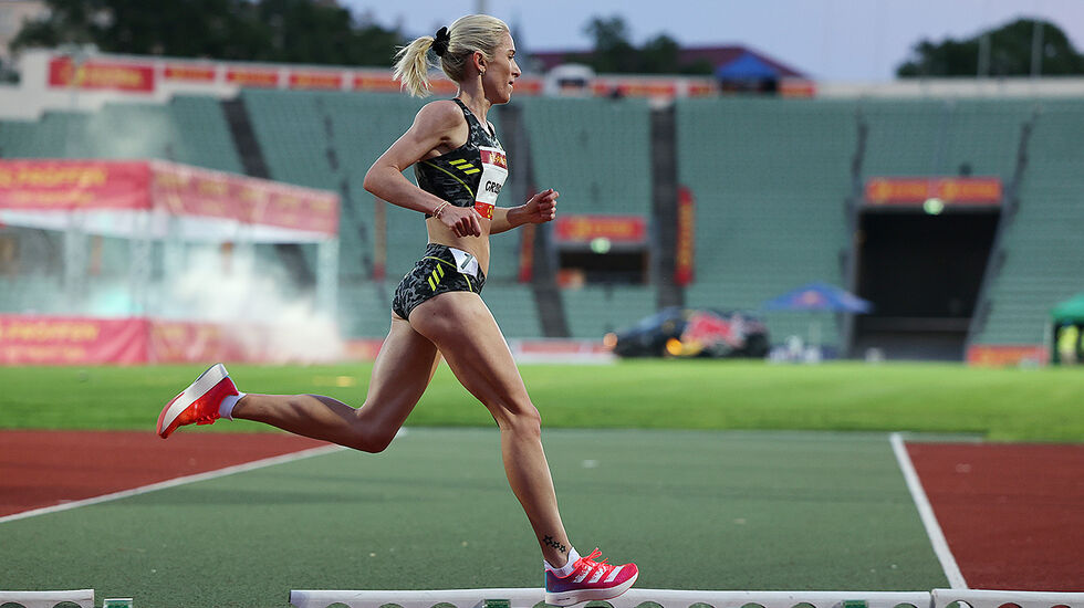 Karoline Bjerkeli Grøvdal løp sterkt på 3000 m med tiden 8:30,84 og dermed raskere enn den norske rekorden til Grete Waitz. Mannlige harer og "ulovlige" sko gjør derimot at tiden hennes ikke vil telle som rekord. (Foto: Samuel Hafsahl)