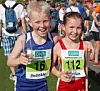 Blide etterpå: 9 år gamle Emma Kirkeberg Mørk, som blir 10 i desember, ramlet i starten og slo kneet. Ikke så lett når nesten dobbelt så høye gutter starter samtidig og det var hele 232 løpere på startstreken. Hun "tjuvstartet" i klassen i fjor (man skal fylle 10 i løpet av året for å løpe 3 km på tid) og løp på 12.17. Etter fallet ble det "bare" 12.30 i år og andreplass i klassen. Så hun deppet en stund, men var like blid igjen straks hun stilte til fotografering sammen med bror Martin, som er 11 og vant klassen.
