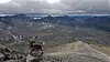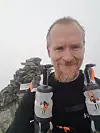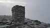 På toppen av Storsmeden var det tett tåke og blåste friskt. Etter å ha tatt et bilde fortsatte jeg raskt vestover ned langs eggen. I bunnen av bandet krysser man den gamle DNT-stien fra Kaldbekkbotn til Langholet før man begynner turen til Trolltiden med å bestige en pyramideformet topp.