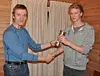 Leder i friidrettsgruppa Egil Prestløkken (t.v) gir vandrepokalen til Edvard K. Nygaard for hans flotte 800m-resultat på 1.54.22.