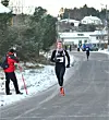 På bildet til høyre (klikk for stor utgave) ser vi Marius Vedvik i føringen på den første bakketoppen etter omtrent 1,3-1,4 km ute i løypen. Nærmest følger Jonas Hammer med startnr. 7 og gjemt bak Marius er det Mulugeta som følger hakk i hæl. Litt bak på bakketoppen er det Halfdan-Emil Færø som sliter litt med åpningstempoet.