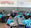 Glade skolebarn: Tidligere rektor på ungdomskolen i Knarvik, Helge Brekke, lærer barna på skolen i Addis Abeba at de må rekke opp hånda før de tar ordet. Barna har akkurat fått sine nye skolegensere som en gave fra ungdomskolen i Knarvik og Knarvikmila.