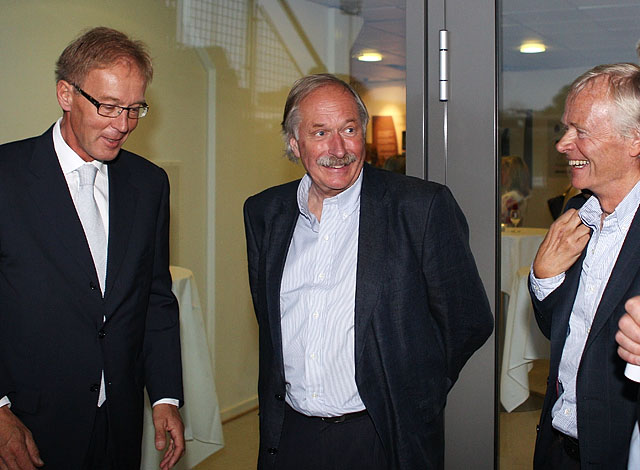 Mingling: Etter minnearrangementet var det hyggelig samvær for mange inviterte gjester. Her er det tidligere friidrettspresident Lars Martin Kaupang (tv) og innehaver av en av de eldste Norgesrekordene i friidrett, 1500 m på 3.37.4 satt i 1976 i munter passiar med Gretes mangeårige trener, Johan Kaggestad, og tidligere Nike-direktør, Erik Mathisen (th), som også var rask på 1500 m med 3.41.8 som pers.