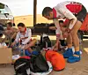 Det er mye å ordne i byttet mellom løping og sykling. Det er påbudt å stoppe i minst en halvtime. Det kunne vært godt med mer hvile, men laget vil ikke kaste bort tid her.