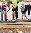 Ingen vannskrekk: Seks- og sjuåringene er klar på badebrygga for 50 meter svømming. Med håndstillingen til lille Jonas ser det ut som om han sender av sted en stille bønn, men det er neppe tilfelle. Han så helt kul og avslappet ut før han skulle kaste seg ut på dypet.