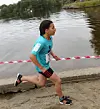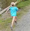 Idyllisk:Victoria på 10 år har skiftet fra svømming til løping og løper langs Skeisvatnet. Det ble andreplass i 10-årsklassen på tida 4.18. Også tiåringene har 50 meter svømming og 600 meter løping som skal gjennomføres.