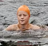 Oransje badehetter:Her er to jenter i en tett duell. Det var de blå brillene som sto best til badehetta, mens de rosa brillene nok er førstevalget for de fleste niårige jenter.