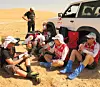 Det norske laget hviler i skyggen av en bil. Herfra blir det buss til teltleir ved kysten. Der må de bestemme seg for om de fortsetter med kajakketappen eller ikke.