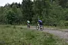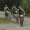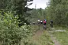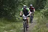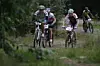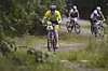Syklistene forsvinner innover i skogen. Her er løypen teknisk krevende