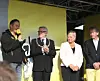 Ordfører Erik Hanstad og rådmann Irene Evenstad Midtlund i Elverum kommune trivdes - i dobbelt forstand - i sentrumdenne fredags ettermiddagen. Til høyre rittleder Birger Hungerholt og til venstre speaker Eirik Thorgersen.