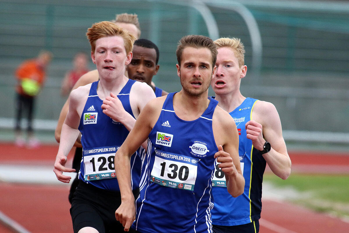 I herrenes heat var det satt opp hare for å få de gode tidene, Anders Bjørndal fra Gneist hadde fått harejobben med målsetting om å dra inn mot en sluttid på 3:52, kanskje noe fortere. I det 14 mann store feltet var det kun Hans-Magnus Haukøy og Lars Lunde som klarte å henge seg på. Hans-Magnus jaktet her på en god tid for å kunne kvalifisere seg til U-18 EM i neste måned. Lars Lunde måtte etter hvert slippe, og brøt til slutt løpet. Men etter at haren slapp ved siste passering var det en annen Gneistløper som svingte seg opp til en glimrende tid, André Seliussen dro inn en tøff spurt på sisterunden . Han forbedret her sin personlige bestetid til 4:01, og tok en solid forbedring av bestetiden sin som han satte i mai på 4:06. Før sesongen var bestetiden hans 4:11, så her tok Gneist-gutten noen store steg fremover. Det er helst på litt lengre distanser André har sin styrke.